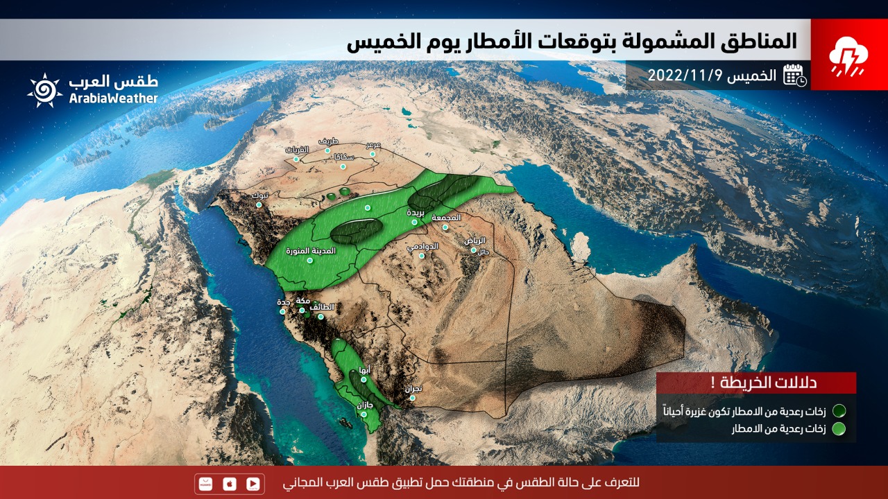 و بحسب المُختصين في مركز "طقس العرب" يُتوقع أن تتأثر شمال المنطقة الوسطى من المملكة يوم الخميس بحالة من عدم الاستقرار الجوي، بحيث تتهيأ الفرصة تدريجياً ساعات نهار يوم الخميس لهطول زخات رعدية من الأمطار بمشيئة الله في مناطق مُتفرقة من شمال المنطقة الشرقية و رفحاء و مناطق حائل و القصيم و المدينة المنورة (خاصةً الاجزاء الشرقية منها) بالإضافة لأجزاء من المرتفعات الجنوبية الغربية، رُبما تكون هذه الزخات غزيرة في بعض الأحياء و تترافق مع تساقط البَرَد و نشاط في الرياح الهابطة المُثيرة للموجات الغُبارية بشكلٍ محلي و مؤقت.