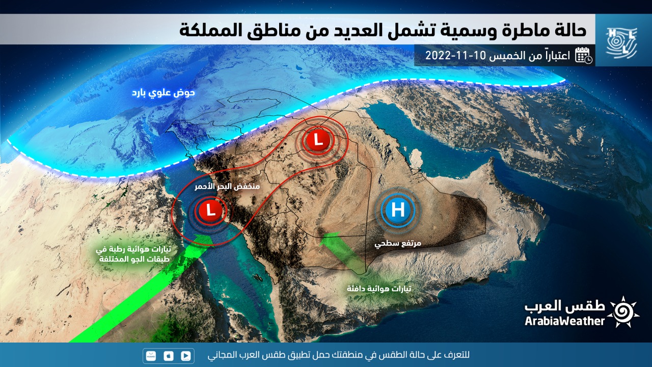 طقس العرب - سنان خلف - تشير مُخرجات أنظمة المُحاكاة الحاسبوية للانظمة الجوية وتوقعات الأمطار في "مركز طقس العرب الإقليمي" إلى بدء تأثر المملكة العربية السعودية اعتباراً من الخميس بحالة جوية ماطرة، تُعتبر الأكثر قوة وشمولية، إذ يُتوقع ان تؤثر على أجزاء واسعة من المملكة وعلى مدار عدة أيام.