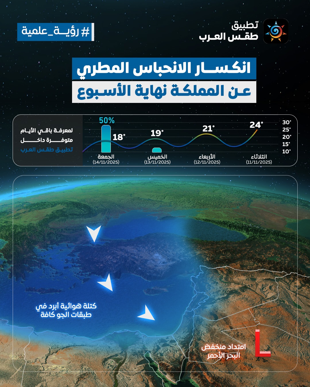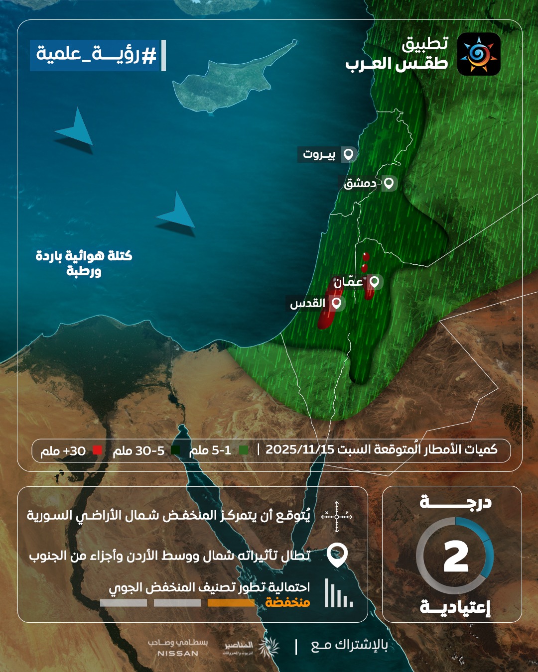 وفي التفاصيل، يتوقع بمشيئة الله أن تتأثر المملكة بدءًا من ساعات فجر وصباح السبت 15/11/2025 بأول منخفض جوي مصنف هذا الموسم، ويترافق مع كتلة هوائية باردة نسبيًا ورطبة لذا يستمر الطقس متقلبًا ما بين الغائم جزئي والغائم وتهطل الأمطار خاصة على المناطق الشمالية والوسطى، ولا يستبعد أن تكون الأمطار غزيرة أحيانًا ويصحبها عبور سحب منخفضة ملامسة لسطح الأرض تعمل على تشكّل الضباب الكثيف.
