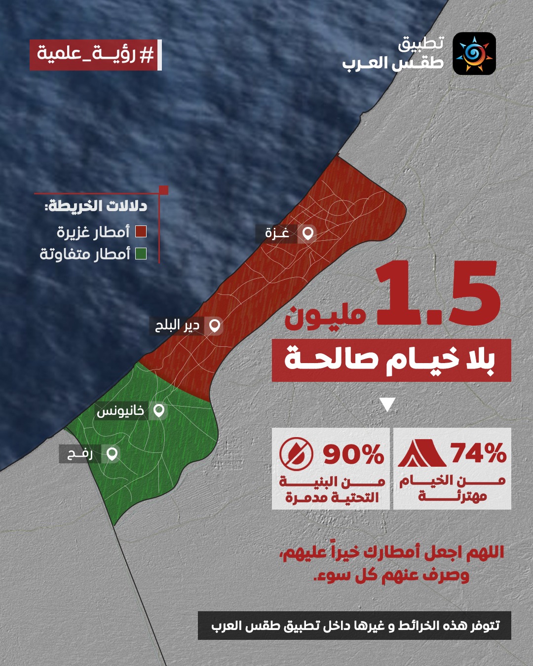 ويتوقع أن تكون حصيلة كميات الأمطار النهائية كبيرة للغاية، وتتراوح من 40 إلى 80 ملم، وقد تلامس 100 ملم في بعض المناطق، مما يؤدي إلى حدوث التجمعات المائية وارتفاع منسوب المياه في ظل تردي الأوضاع المعيشية الصعبة. كان الله في عون إخوتنا في القطاع، اللهم أنزل عليهم دفء رحمتك.