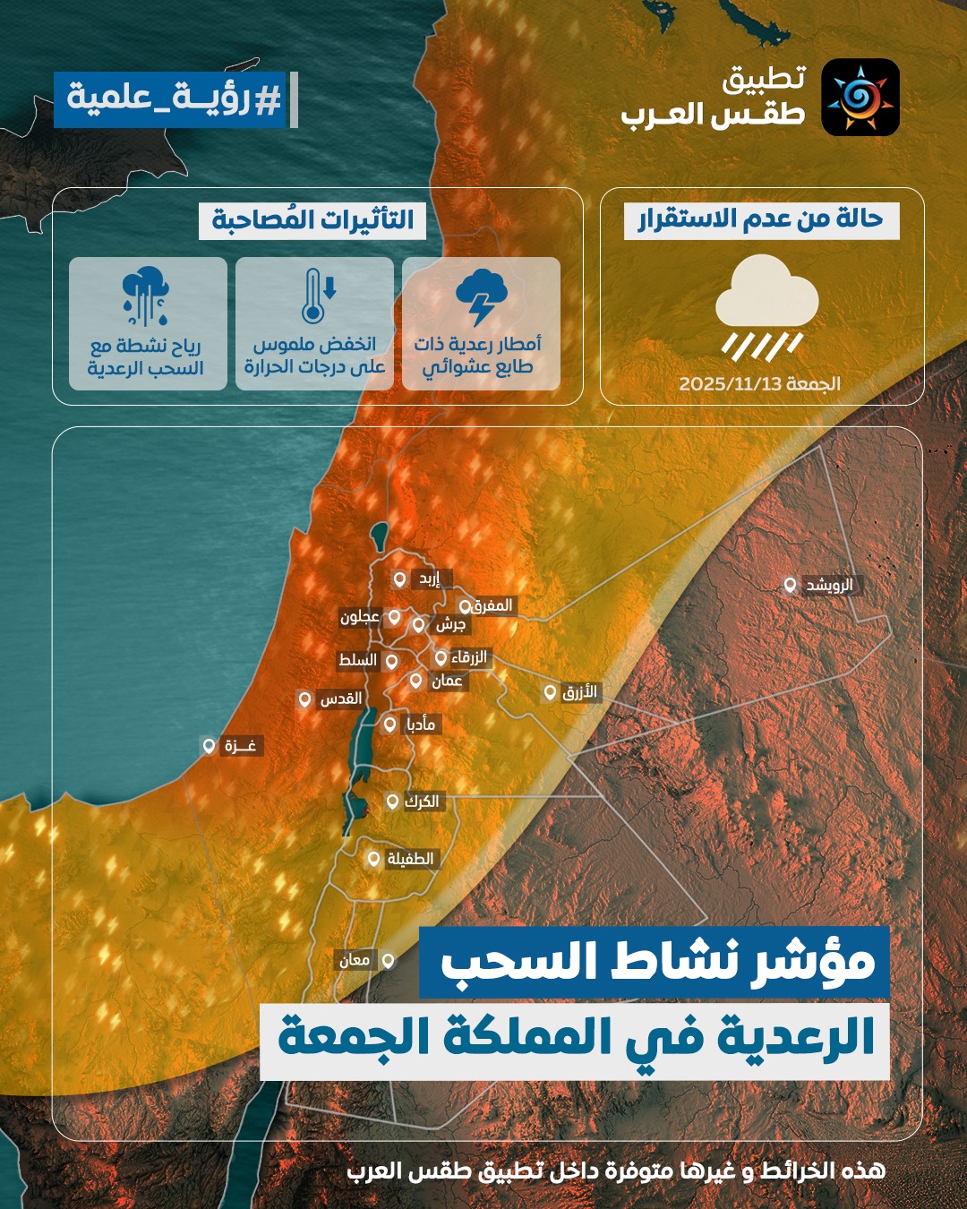 طقس العرب - تشير آخر صور الأقمار الاصطناعية عبر تطبيق طقس العرب إلى رصد حزام كثيف من السحب الرعدية بدأ يعبر الأراضي الفلسطينية، ويتوقع أن يمتد إلى الأردن الساعات القادمة لتسود بذلك أحوال جوية غير مستقرة في مختلف مناطق المملكة.