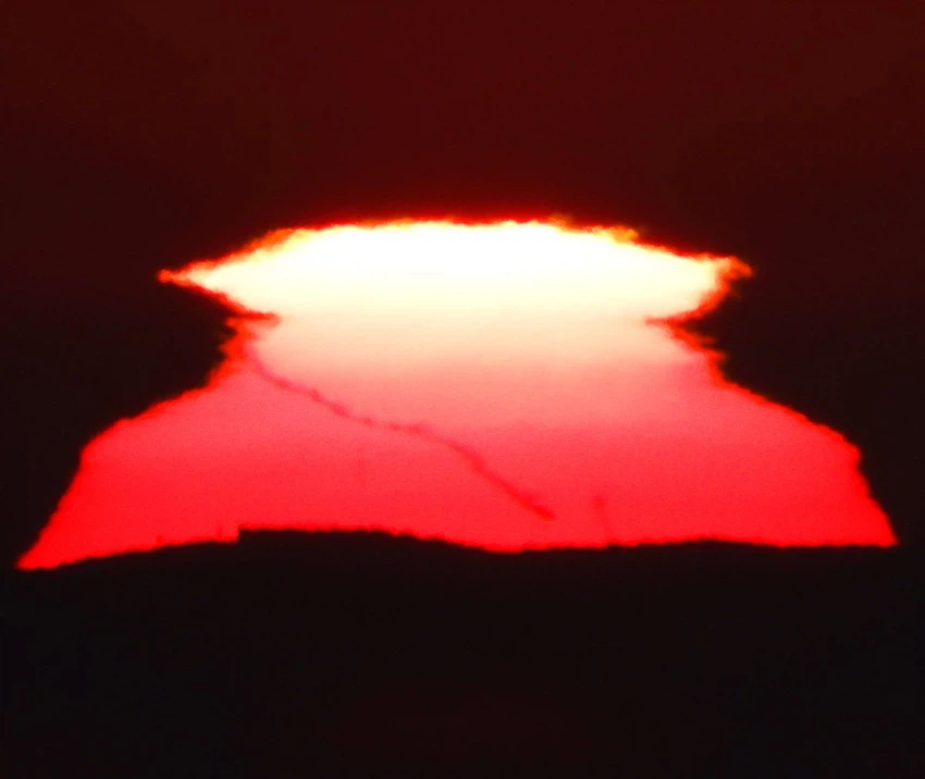 وظهرت هذه الخيوط كتركيب داكن داخل قرص الشمس، في مشهد غير مألوف تزامن مع تشوّه واضح في شكل الشمس نتيجة الانكسار الضوئي القوي في طبقات الغلاف الجوي، خاصة مع وجود نسب رطوبة مرتفعة في الأفق الغربي.