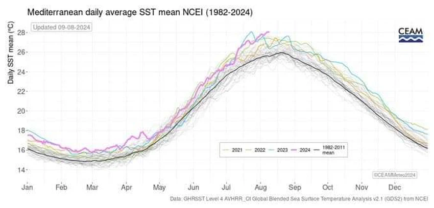 طقس العرب - أعلن المركز المتوسطي للدراسات البيئية (CEAM) أن شهر أغسطس 2024 سجل أعلى متوسط يومي لدرجة حرارة سطح البحر الأبيض المتوسط منذ بداية التسجيلات عام 1982، حيث بلغ المعدل 28.08 درجة مئوية. هذا الارتفاع القياسي يعكس التأثير المتزايد لتغير المناخ المتسارع على النظام البيئي للمنطقة.