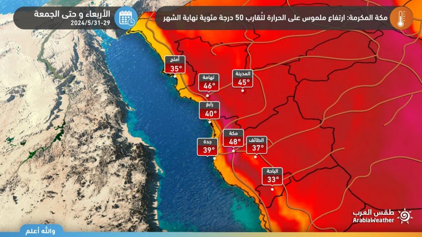 و تُشير الخرائط الجوية في مركز طقس العرب بأنه يُتوقع أن ترتفع درجات الحرارة بدءاً من يوم الثلاثاء 28 مايو 2024 على غرب المملكة بما فيها مكة المكرمة و توالي ارتفاعها مع نهاية الأسبوع القادم لتتراوح ما بين 46-48 درجة مئوية في المشاعر المقدسة.