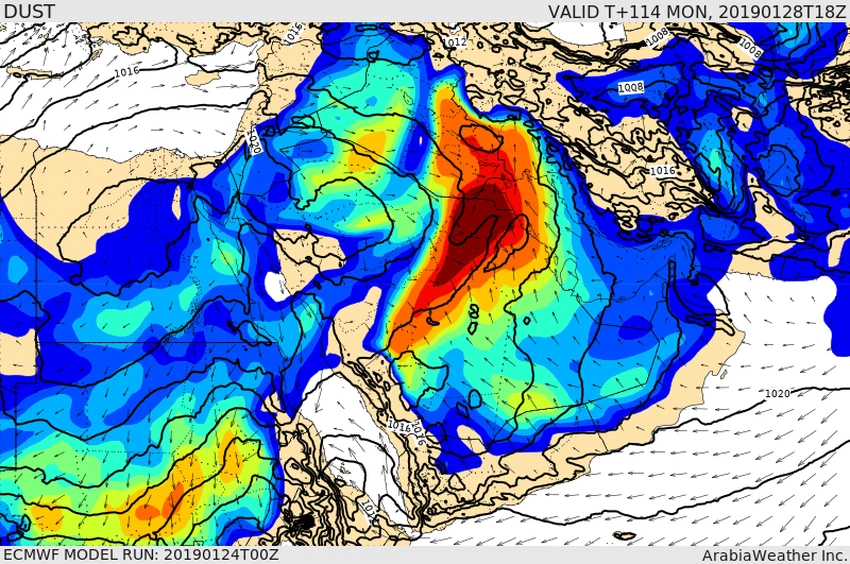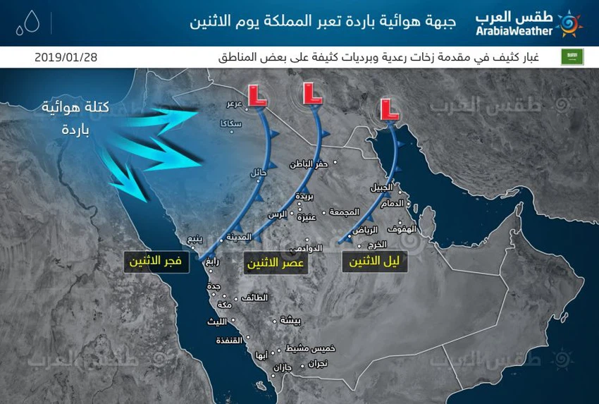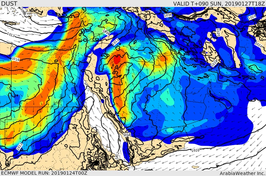 الأحد؛ تتشكل أولى موجات الغبار عصر ومساء الأحد الموافق 27 يناير 2019، على مدينة جدة وربما مكة المكرمة إضافة الى الأجزاء الشرقية من غرب المملكة ومناطق حائل الجوف ووسط وشرق الحدود الشمالية، حيث تهب رياح جنوبية الى جنوبية غربية نشطة السرعة مع هبات قوية أحياناً وتعمل على انخفاض الرؤية الافقية بشكل كبير، قد تصل الى حد انعدام تام على الرؤية الافقية.