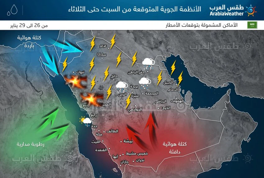 ويشير طقس العرب الى تشكل نطاق مُمطر ورعدي في شمال غرب المملكة ويتحرك تباعاً نحو الجنوب والشرق، وعلى مدار أربعة أيام متواصلة يشمل تأثير ذلك الحزام معظم مناطق المملكة بالتدريج، وعلى النحو التالي،