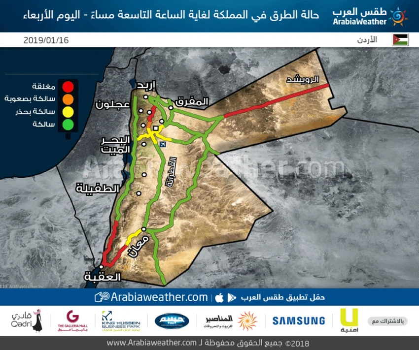 - الطرق الخارجية في محافظة عجلون، سالكة وبحذر شديد. - طريق جامعة عجلون باتجاه اربد، مغلقة بسبب الثلوج والانزلاقات.