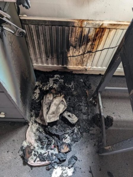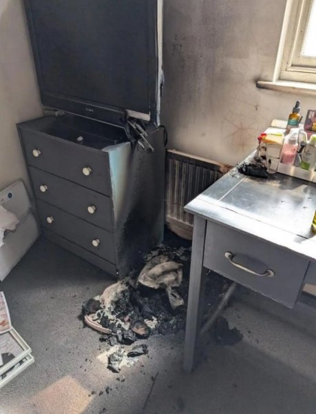 ووصلت شاحنتا إطفاء وأخمدتا حريق الطابق الثالث، وتمكن فريق الإطفاء أيضًا من إنقاذ قط العائلة ولحسن الحظ، بينما دُمِرَت العديد من العناصر في غرفة النوم، تم احتواء النيران إلى حد كبير بفضل باب مغلق، ما منع انتشارها إلى أجزاء أخرى من المنزل.