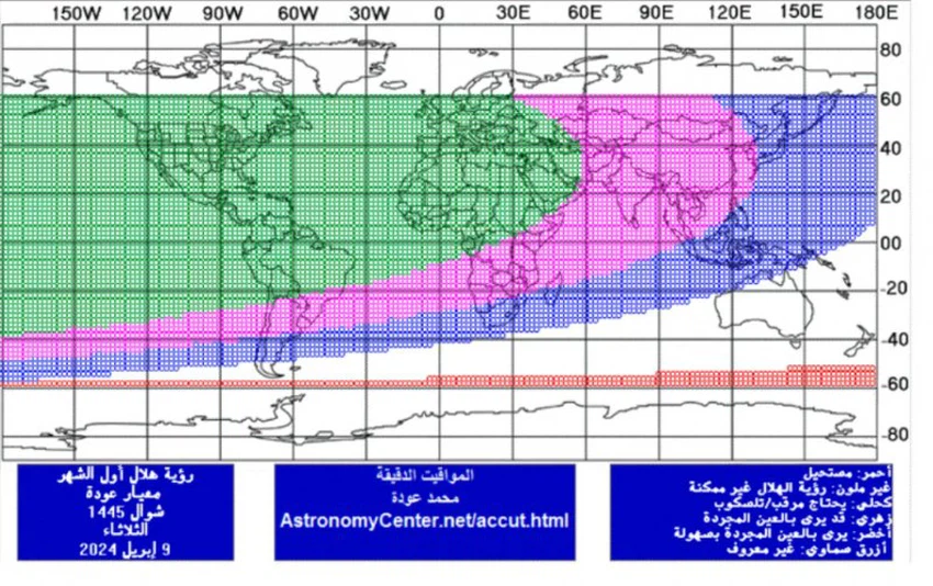 فإن رؤية الهلال في ذلك اليوم ممكنة باستخدام التلسكوب من شرق العالم وجنوب أفريقيا، وبصعوبة بالعين المجردة من وسط آسيا ووسط القارة الأفريقية.