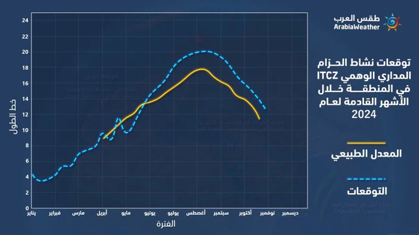 و قال المُختصون في مركز طقس العرب بأن المؤشرات الفصلية تُشير بأنه ما يُعرف بالحزام المداري ITCZ و هو حزام وهمي يُرافق الكتل الهوائية الرطبة من المُتوقع أن يكون مُتقدماً على نحو أكثر من المُعتاد لدواخل شبه الجزيرة العربية و تحديداً في فترات من شهري يوليو و أغسطس، و يتسبب هذا الحزام إذا ما ترافق مع ظروف جوية أخرى مُناسبة بحدوث موجات من الرطوبة تؤدي إلى اشتداد الأمطار الرعدية على مصايف المملكة السعودية و جبال الإمارات و سلطنة عُمان و اليمن مما يؤدي إلى ارتفاع فرص حدوث السيول في هذه المناطق.