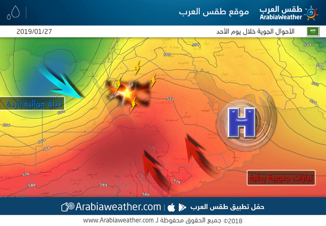 وتُفيد أخر التحديثات الجوية الواردة من غرفة عمليات التنبؤات الجوية في طقس العرب الى اقتراب الكُتلة الهوائية الباردة تدريجياً خلال يوم الأحد من نواحي بلاد الشام ومصر يٌقابلها اندفاع لتيارات جنوبية رطبة مصدرها من بحر العرب والبحر الأحمر ، لذلك تسود أجواء ماطرة في مختلف مناطق تبوك ، الجوف ، الشمالية وأجزاء من حائل كما تزداد شدتها بحيث تكون الهطولات مُتوسطة الى غزيرة يرافقها تساقط زخات من البرد مما يؤدي الى تشكل السيول في الاودية والمناطق الجبلية وبخاصة على سواحل تبوك.