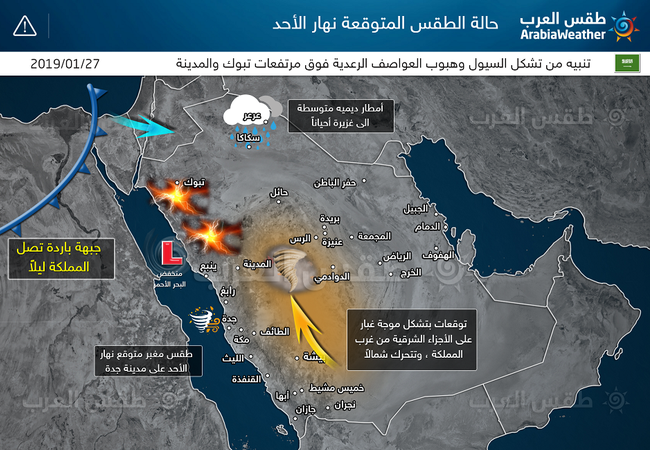 أولى موجات الغبار يُتوقع أن تتشكل عصر ومساء الأحد الموافق 27 يناير 2019، على مدينة جدة وربما مكة المكرمة إضافة الى الأجزاء الشرقية من غرب المملكة ومناطق حائل الجوف ووسط وشرق الحدود الشمالية، حيث تهب رياح جنوبية الى جنوبية غربية نشطة السرعة مع هبات قوية أحياناً وتعمل على انخفاض الرؤية الافقية بشكل كبير، قد تصل الى حد انعدام تام على الرؤية الافقية.