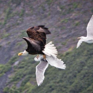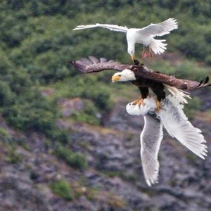وعلى الرغم من محاولته انقاذ صديقه، إلا أن طائر النورس فشل؛ فبعد قيام النسر بالتقاط فريسته والتحليق بها، حاول النورس اللحاق به ونقره في ظهره لتخليص رفيقه؛ إلا أن محاولاته باءت بالفشل.