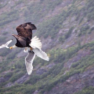 ورصد "كانالز" لقطات ملحمية لطائر نورس يحاول تخليص رفيقه من بين مخالب النسر، بمنطقة "برينس ويليام ساوند" بولاية ألاسكا، التي قضى فيها المصور نحو 11 يوماً.
