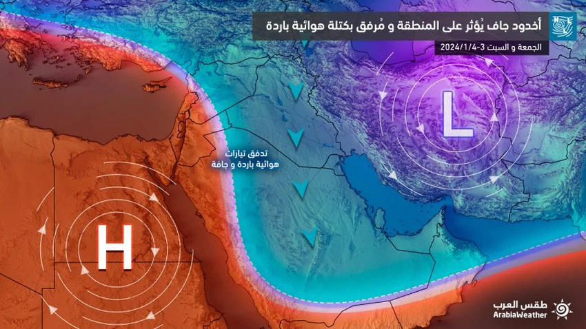 God willing, it is expected that a trough of dry low pressure will cross the region’s atmosphere, accompanied by an extremely cold air mass, so that temperatures will drop below their usual rates by more than 5-7 degrees Celsius, including most regions of the Kingdom of Saudi Arabia, Kuwait, Qatar, Bahrain, the Emirates, and the Sultanate of Oman, and colder than usual weather will prevail.