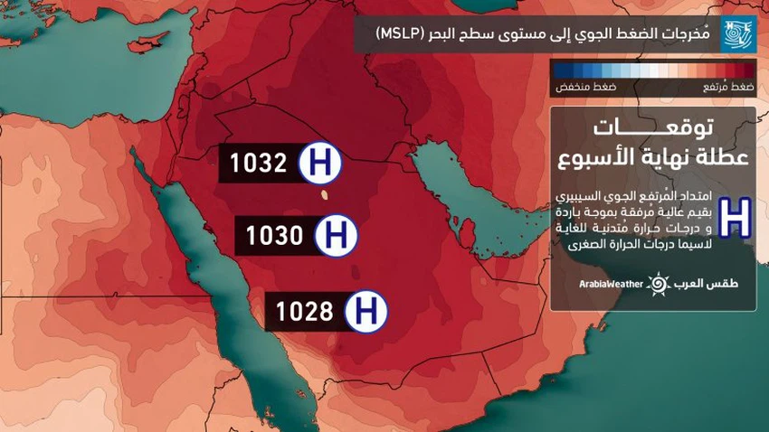 The Siberian high extends with very high values towards the region, especially the Kingdom of Saudi Arabia, where the impact of the cold wave is severe, as temperatures drop to nearly zero degrees Celsius in the regions of the northern borders, Al-Jawf, Hail, Al-Qassim, northern Riyadh, and the northeastern region, with very cold weather at night.