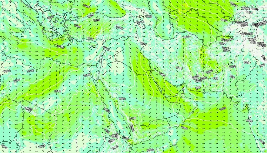 Arab Weather - The latest weather maps from Arab Weather indicate that strong winds will be active this weekend, Friday and Saturday, spanning eastern and central Saudi Arabia, Kuwait, Qatar, Bahrain, and the UAE and Oman.