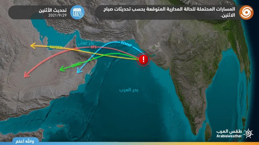 Weather Arabs - watching a cadre of weather forecasts in the Regional Weather Arab Center closely developments in the situation of tropical Gulab that these moments affect the state of India before heading later towards the eastern part of the Arabian Sea, putting the Sultanate of Oman and the UAE under surveillance, given the likelihood of the impact of tropical situation "Gulab on these countries.