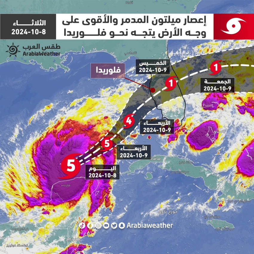 Arab Weather - The latest satellite images and data from global hurricane monitoring centers monitor the continuous and rapid development of Hurricane Milton, which is classified as a Category 5 hurricane, and is considered the strongest and most violent on Earth, as wind speeds around the center are estimated at 250 km/hour.