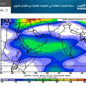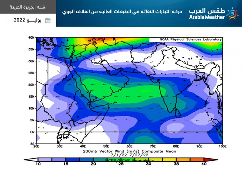 Specialists in the Arab Weather Center say that the general pattern of the atmosphere witnessed a remarkable change in the region during the month of July, represented by the displacement of the "eastern" tropical jet stream from the south of the Indian subcontinent towards its north, and thus provided the opportunity to enter and extend the Monsoon depressions towards the south of the Arabian Peninsula in an unusual way. The behavior of the eastern jet stream (which are fast-moving air currents that occur at high altitudes) was capable of shifting the subtropical high altitude sometimes to the north towards the Levant and at other times to the Iranian lands, giving way to the penetration of the humid tropical winds towards the Arabian Peninsula forming extended eastern grooves From the primary (mother) depression. This shift in the jet wind system in the upper atmosphere, as mentioned above, also had a great impact on the flow of water vapor with tropical characteristics, exceptionally, from the northwest Pacific Ocean through northern India towards the atmosphere of the Arabian Peninsula.