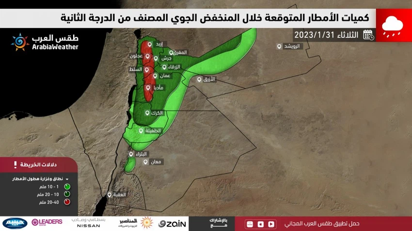 Weather of Arabia - weather maps in the Arab Weather Center indicate that a cold air mass rushes through eastern Europe towards the waters of the White Sea, leading to the formation of an air depression in the vicinity of the island of Cyprus, which is classified as second-degree (normal winter depression) according to the innovative depression intensity index. In the Arab weather, it is associated with a cold air mass, and its effects begin on the Kingdom, starting from the dawn and morning hours of Tuesday
