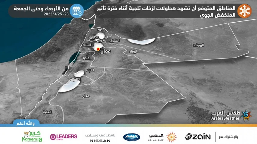Snow is expected to fall on the high mountain heights of more than 1,000 meters above sea level in the north and center of the Kingdom in the morning, while it is expected that snow will continue to fall on the high peaks of the Jerash and Ajloun mountains for the rest of the day, while the snow becomes mixed with rain in the mountains of the capital and Al Balqa, Coinciding with the crossing of low clouds and touching the surface of the earth, thick fog continues to form over the high mountainous heights.