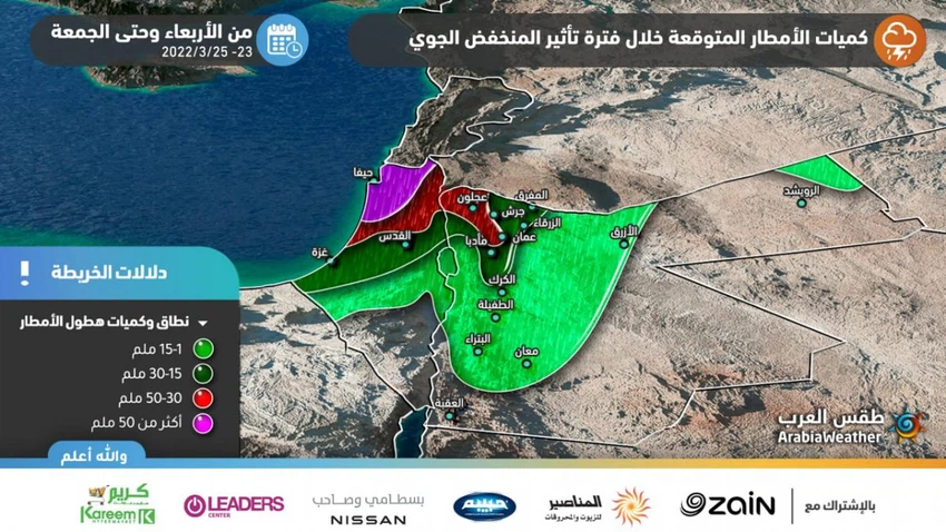 It is expected that the depression will be accompanied by moderate westerly to southwesterly winds of active speed, accompanied by strong gusts exceeding the 70 km/h barrier over mountainous heights and open areas, and working to raise dust and dust in desert areas, including desert roads in the south and east of the Kingdom.
