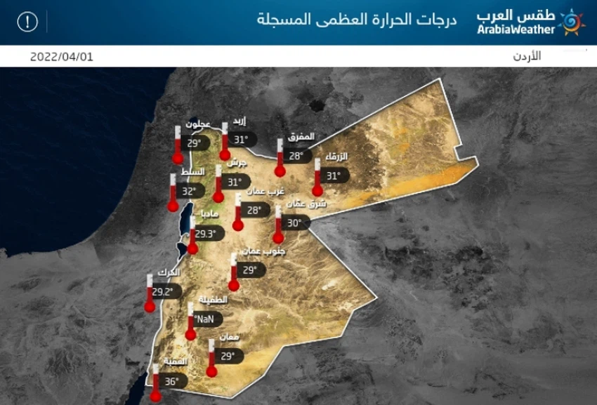 Arab Weather - The meteorological stations of the Arab Regional Weather Center recorded maximum temperatures for the first time this year on Friday 1/4/2022, the highest in the city of Aqaba.