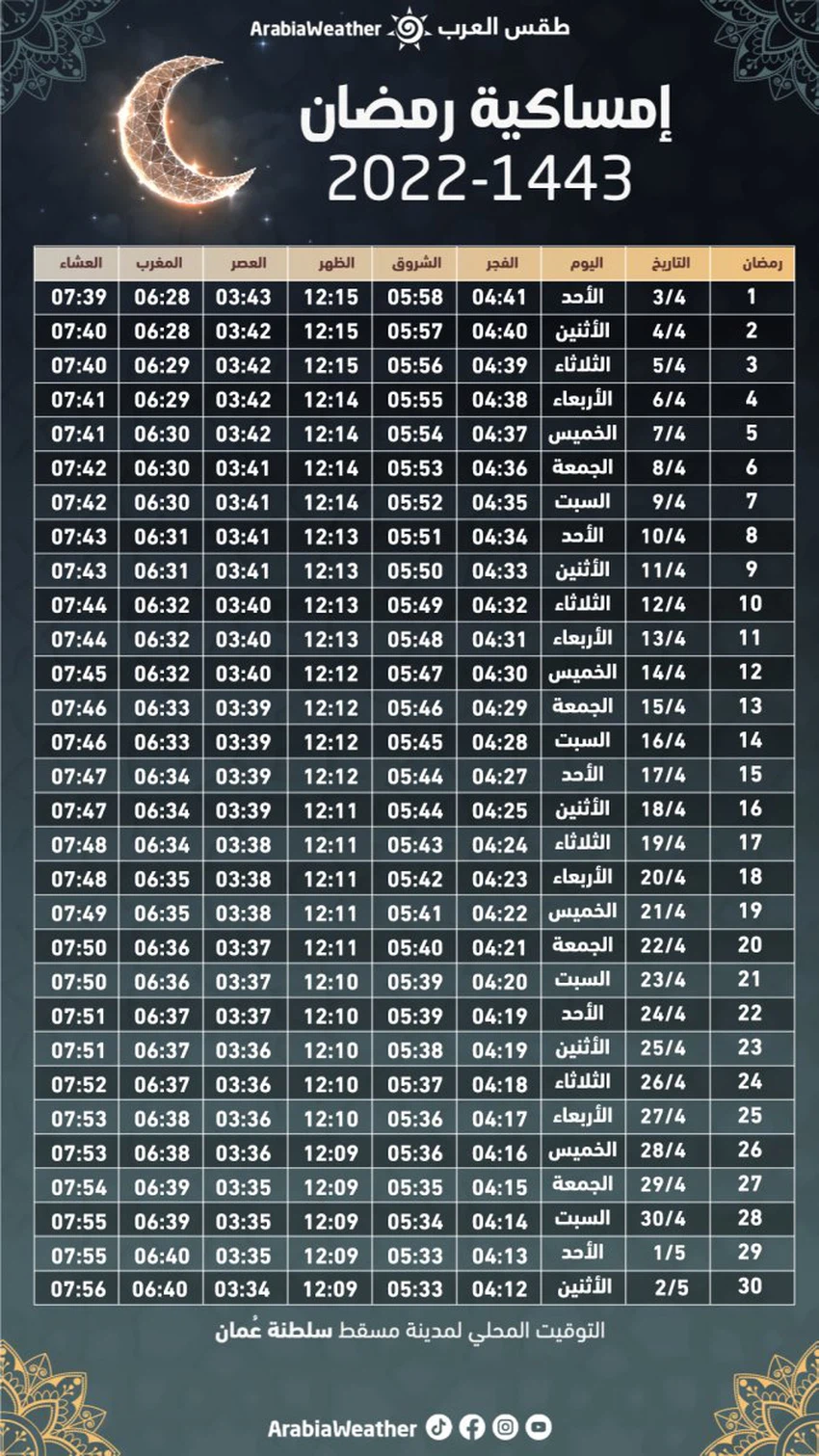 The number of fasting hours in Muscat on the first day of Ramadan will be 13 hours and 46 minutes , gradually increasing with the days to reach the last day of Ramadan to about: 14 hours and 28 minutes . The following are the times of Ramadan in Muscat - Sultanate of Oman: