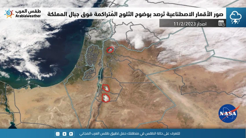 Weather of Arabia - On Friday 10/2/2023, satellite images monitored snow covering the peaks of the governorates of Karak and Tafila, in addition to the heights of the governorates of Jerash and Ajloun, as shown in the map below.
