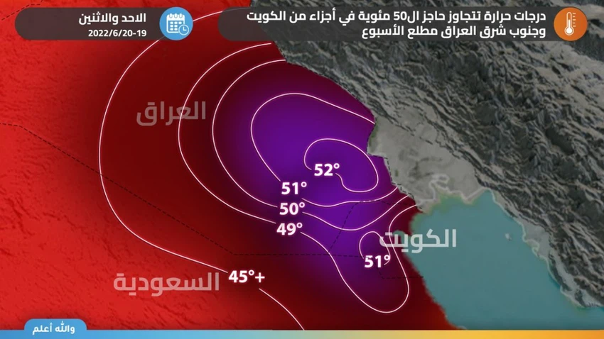 The flaming center of the very hot air mass is also located above Kuwait on Saturday and the beginning of next week, so there is a rise in temperatures and the weather is very hot, and the maximum temperatures touch 50 degrees Celsius in some interior areas, especially the city of Jahra and may exceed that in some parts.