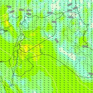 Arab Weather - The weather maps processed by the Arab Weather Regional Center indicate that active westerly to northwesterly winds will blow over most areas of the Levant Desert, northern Saudi Arabia, and Iraq. The winds will be accompanied by strong gusts exceeding 80 km/h, which will lead to the formation of dense dust waves on Thursday, God willing.