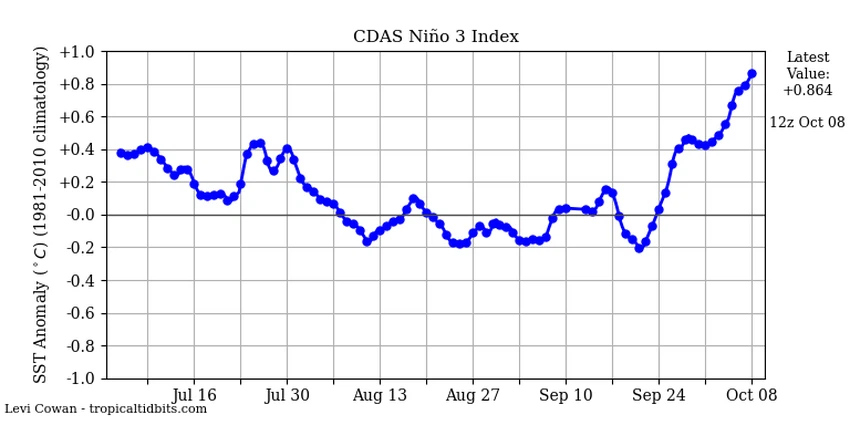 وطبقا لاخر التحديثات المناخية مساء اليوم الاثنين 8 أكتوبر 2018 م فقد رصدت مؤشرات الاحترار في المحيط الهادي ارتفاع درجات الحرارة الى قيم تجاوزت 0.8 درجة مئوية حيث سجلت درجة الحرارة