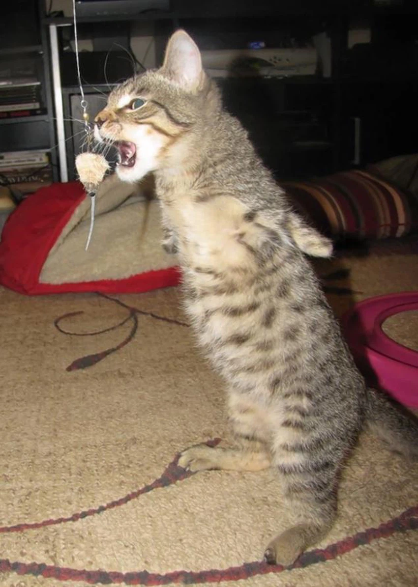 القطّ تأقلم بسُرعة مع عدم وجود الأطراف الأمامية وأصبحت لهُ أطراف خلفيّة قويّة تساعده على الوقوف واللعب و القفز الحركة بشكل طبيعي كأي قطّ آخر.