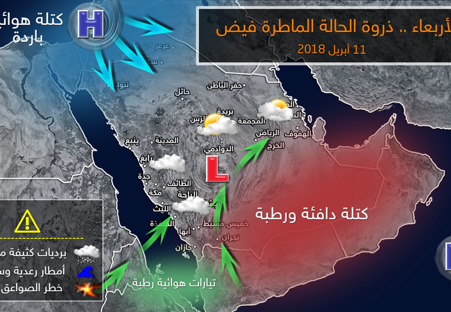 سنان خلف - تواصل الحالة الماطرة "فيض" تأثيرها على المملكة نهار اليوم الأربعاء 11 أبريل لتصل إلى ذروتها مع ساعات مع ساعات العصر والمساء، حيث تتكاثر السُحب المُحملة بالأمطار الرعدية والبرديات بمشيئة الله تعالى في مناطق واسعة من المملكة.