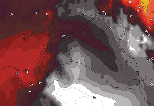 Cette forte différence de température entre l'est et l'ouest de la Jordanie est due à la concentration d'une masse d'air chaud venant de la péninsule arabique sur les régions orientales, tandis que la différence de couleurs sur la carte est perceptible à l'ouest du Royaume, où elle représente un masse d'air moins chaude accompagnée de courants marins qui brisent l'intensité de la chaleur. A noter également que la météo nocturne dans l’ouest du Royaume sera modérée et propice aux séances en extérieur.