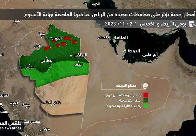 Quant à jeudi, la dépression devrait s'approfondir dans les hautes couches de l'atmosphère au-dessus du Royaume d'Arabie Saoudite, de sorte que les perturbations météorologiques s'intensifieront dans de nombreuses parties de la région, en particulier dans les gouvernorats du nord, de sorte que de fortes précipitations se produiront dans Les zones géographiques en général sont étroites et dispersées, et la capitale, Riyad, sera de plus en plus touchée par les pluies, qui ont plu à plusieurs reprises à partir de jeudi, en particulier entre l'après-midi et les premières heures de la nuit.