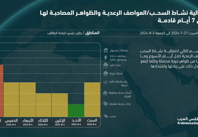 <p style=";text-align:left;direction:ltr">Du Centre météorologique arabe - Les dernières données résultant de la simulation informatique du Centre météorologique arabe indiquent qu'il est prévu qu'il y ait une activité accrue en raison des pluies estivales cette semaine dans de nombreuses régions du sud-ouest et de l'ouest du Royaume. d'Arabie Saoudite, si Dieu le veut.</p><p style=";text-align:left;direction:ltr"></p><h2 style=";text-align:left;direction:ltr"> <strong>Infographie : Zones couvertes par la pluie dans le Royaume cette semaine</strong></h2><p style=";text-align:left;direction:ltr"> Les spécialistes du Centre météorologique d'Arabie ont déclaré qu'il est prévu que l'activité des cumulonimbus reprenne dans de nombreuses régions du Royaume au cours des prochains jours sur les hauts plateaux de Jazan, Asir, Al-Baha et au sud-est de La Mecque, et que cela pourrait affecter certaines parties. d'Al-Tihamah certains jours, et s'accompagnera de précipitations d'intensité variable accompagnées de l'apparition d'orages et d'une activité dans les vents descendants remuant la poussière avant la pluie.</p><p style=";text-align:left;direction:ltr"> Il est prévu, si Dieu le veut, que les pluies estivales s'intensifieront et s'étendront dans leur zone au sud-ouest et à l'ouest du Royaume d'ici la fin de la semaine, s'étendant à plusieurs parties des régions de Jazan, Asir, Al-Baha et La Mecque Al-Mukarramah, et s'étend également à certaines zones côtières, en particulier les côtes de Jazan, Asir et le sud de La Mecque Al-Mukarramah. L'intensité des pluies augmente, devenant plus fortes et parfois accompagnées de fortes grêles, ce qui entraîne des écoulements. dans les vallées et les récifs et une montée des eaux sur les routes. </p><p style=";text-align:left;direction:ltr"></p><p style=";text-align:left;direction:ltr"><img alt="" src="/sites/default/files/uploads-2020/WhatsApp%20Image%202024-07-27%20at%2020.51.59_830cbdc3.jpg" style="width: 800px; height: 450px;" /></p><p style=";text-align:left;direction:ltr"></p><p style=";text-align:left;direction:ltr"> Il est prévu, si Dieu le veut, que les risques de pluie se poursuivront dans les stations balnéaires du Royaume au cours des prochaines semaines, en raison d'un flux d'humidité tropicale attendu vers le sud de la péninsule arabique, accompagnant l'avancée de ce que l'on appelle la ceinture tropicale imaginaire. Le chauffage solaire et la topographie du sud-ouest du Royaume jouent également un rôle important dans la formation des cumulus.</p><p style=";text-align:left;direction:ltr"></p><p style=";text-align:left;direction:ltr"> Dieu seul sait.</p><hr /><p style=";text-align:left;direction:ltr"></p><p style=";text-align:left;direction:ltr"> <strong>Voir également:</strong></p><p style=";text-align:left;direction:ltr"> <a href="https://www.arabiaweather.com/%D8%A7%D9%84%D9%86%D8%B4%D8%B1%D8%A9-%D8%A...étéo détaillée en Arabie Saoudite pour les 4 prochains jours</strong></a></p><p style=";text-align:left;direction:ltr"> <a href="https://www.arabiaweather.com/%D8%A7%D9%84%D9%86%D8%B4%D8%B1%D8%A9-%D8%A... prévisions météorologiques saisonnières attendues en Arabie Saoudite</strong></a></p><p style=";text-align:left;direction:ltr"></p>