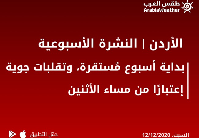 الأثنين - تتأثر المملكة نهار يوم الإثنين بجبهة هوائية دافئة في مقدمة تأثير منخفض جوي يقترب تدريجيًا من المنطقة، وتكون درجات الحرارة مرتفعة وأعلى من معدلاتها بحوالي 7 إلى 9 درجات مئوية ويتحول الطقس تدريجيًا ليصبح مغبر خاصة في جنوب وشرق المملكة، ومع ساعات مساء الاثنين و ليل الاثنين/الثلاثاء يزداد تأثر المملكة بالأحوال الجوية غير المستقرة الناتجة عن اقتراب للمنخفض الجوي الذي سيتواجد في المنطقة الشرقية للبحر الابيض المتوسط وتنخفض درجات الحرارة بشكل واضح ليصبح الطقس بارد ومغبر بشكل عام، ويُتوقع هطول زخات رعدية من الأمطار في أجزاء متفرقة من المملكة قد تكون غزيرة أحيانًا في بعض المناطق كما وتشمل مدينة العقبة.