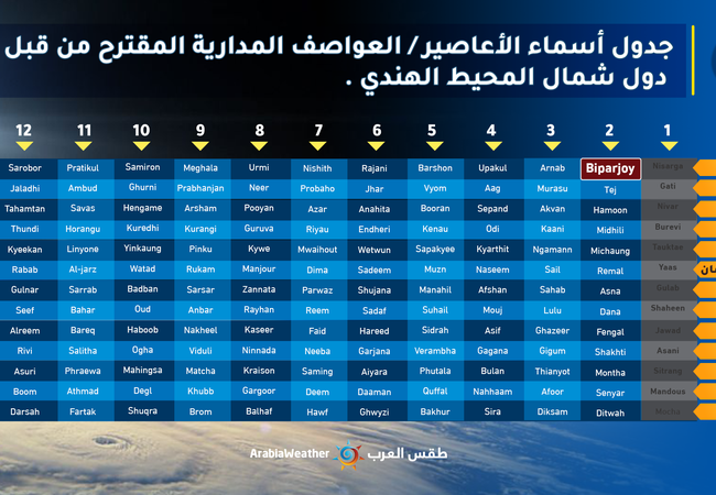 Les États tropicaux qui se forment dans le nord de l'océan Indien sont nommés par le Centre régional spécialisé de météorologie basé à New Delhi (Inde) au nom des pays membres de l'Organisation météorologique internationale.