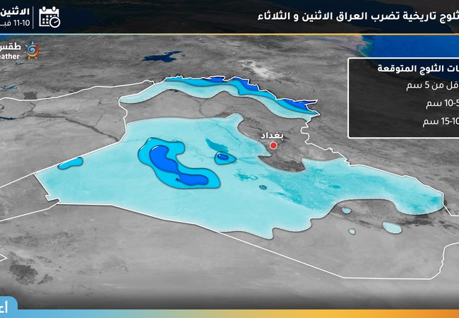 و لن يكون من المُستغرب تراكم بعض الثلوج في بعض أحياء هذه المناطق بما فيها بعض أحياء العاصمة بغداد، و سيكون بلا شك منظر تاريخي في حال استيقظت العاصمة العراقية بغداد صبيحة الثلاثاء على بساط ثلجي أبيض. علاوة على ذلك، فإن درجات الحرارة مُتوقع أن تصل إلى ما دون الصفر المئوي في أغلب مناطق العراق و كذلك العاصمة وسط أجواء تُوصف بأنها قارسة البرودة خاصة مع ساعات الليل.