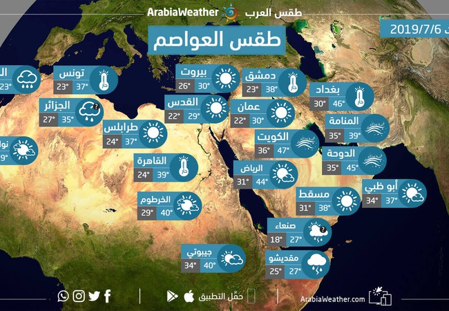 <p style=";text-align:left;direction:ltr">Météo arabe - conditions météorologiques et températures prévues dans les capitales et villes arabes le samedi 7-6-2019 :</p><p style=";text-align:left;direction:ltr"></p><h2 style=";text-align:left;direction:ltr"> <strong>Météo au Levant et en Egypte :</strong></h2><h3 style=";text-align:left;direction:ltr"> <strong>Météo entre été normal et relativement chaud dans la plupart des régions</strong></h3><ul style=";text-align:left;direction:ltr"><li style=";text-align:left;direction:ltr"> Le temps reste entre l'été normal et relativement chaud, et les températures se situent au début des années trente en Jordanie, en Palestine et dans la Bekaa au Liban, qui se situent autour de leurs taux normaux pour cette période de l'année.</li><li style=";text-align:left;direction:ltr"> Le temps reste chaud dans la ville de Damas, et dans les régions de la vallée du Jourdain, de la mer Morte, d'Aqaba et des régions syrienne et jordanienne de Badia, où les températures se situent approximativement à la fin des années 30 Celsius <span>.</span></li><li style=";text-align:left;direction:ltr"> Les températures sont plus douces dans les montagnes libanaises <span>.</span></li><li style=";text-align:left;direction:ltr"> Les niveaux d'humidité augmentent en Palestine et sur certaines parties des côtes libanaises et syriennes, jusqu'au nord de la Jordanie et sur les hauteurs du Golan, à l'aube et au petit matin avec l'apparition de nuages bas <span>.</span></li><li style=";text-align:left;direction:ltr"> Le temps continue d'être chaud dans la plupart des régions d'Égypte, et du brouillard devrait se former dans certaines parties des régions du nord aux premières heures du matin en raison de la forte humidité <span>.</span></li></ul><p style=";text-align:left;direction:ltr"></p><h2 style=";text-align:left;direction:ltr"> <strong>La météo dans les pays du Golfe arabe :</strong></h2><h3 style=";text-align:left;direction:ltr"> <strong>La poursuite des vents actifs sur l'Irak et la région du golfe Persique</strong></h3><ul style=";text-align:left;direction:ltr"><li style=";text-align:left;direction:ltr"> On s'attend à ce que l'Irak (en particulier ses régions méridionales <span>)</span> , le Koweït, l'est de l'Arabie saoudite et certaines parties du centre du Qatar, Bahreïn et les régions occidentales des Émirats continuent d'être affectés par des vents actifs du nord au nord-ouest, travaillant à soulever la poussière et la poussière dans l'intérieur et les zones dégagées, en plus des turbulences de la mer <span>.</span></li></ul><ul style=";text-align:left;direction:ltr"><li style=";text-align:left;direction:ltr"> Des vents actifs soufflent également sur la ville de Djeddah et sur certaines parties de la côte de la mer Rouge <span>.</span></li></ul><ul style=";text-align:left;direction:ltr"><li style=";text-align:left;direction:ltr"> Le temps est généralement très chaud et les températures approchent les 44-45 degrés Celsius à Bagdad et à Riyad, et atteignent environ 46-47 degrés Celsius dans les régions intérieures du Koweït et du sud de l'Irak <span>.</span></li></ul><ul style=";text-align:left;direction:ltr"><li style=";text-align:left;direction:ltr"> Les prévisions continuent de former des nuages orageux au cours de l'après-midi et de l'après-midi sur les hautes terres de l'ouest du Yémen et sur des parties limitées des hautes terres du sud-ouest de l'Arabie saoudite, mais elles restent généralement moins répandues que la situation normale pour cette période de l'année <span>.</span></li></ul><p style=";text-align:left;direction:ltr"></p><h2 style=";text-align:left;direction:ltr"> <strong>La météo dans les pays du Maghreb :</strong></h2><h3 style=";text-align:left;direction:ltr"> <strong>Temps chaud dans la plupart des régions de l'intérieur de l'Algérie et de la Tunisie... et nuages orageux sur les montagnes de l'Atlas au Royaume du Maroc</strong></h3><ul style=";text-align:left;direction:ltr"><li style=";text-align:left;direction:ltr"> Le temps continue d'être généralement chaud dans les régions intérieures de la Tunisie et de l'Algérie, et le temps chaud s'étend à certaines zones côtières, mais le temps reste généralement humide et les températures sont généralement plus basses dans les régions côtières algériennes <span>.</span></li><li style=";text-align:left;direction:ltr"> Les températures restent modérées dans la plupart des régions du nord de la Libye, avec des vents actifs du nord traversant la Méditerranée <span>.</span></li><li style=";text-align:left;direction:ltr"> Le Royaume du Maroc continue d'être affecté par des courants doux et humides provenant de l'océan Atlantique <span>.</span></li><li style=";text-align:left;direction:ltr"> Des nuages orageux sont attendus dans différentes parties des hauts plateaux de l'Atlas, concentrés sur les montagnes du Moyen Atlas <span>.</span></li></ul><p style=";text-align:left;direction:ltr"></p><h2 style=";text-align:left;direction:ltr"> <strong>Météo dans le monde :</strong></h2><ul style=";text-align:left;direction:ltr"><li style=";text-align:left;direction:ltr"> Vents froids du nord soufflant de la mer du Nord vers le Danemark, le nord de l'Allemagne et la Pologne, abaissant considérablement les températures et les précipitations <span>.</span></li><li style=";text-align:left;direction:ltr"> Des nuages orageux sont attendus dans le centre de la France et dans certaines parties de la Suisse, de l'Autriche et du nord de l'Italie, qui pourraient être accompagnés de fortes pluies et de grêle locale <span>.</span></li><li style=";text-align:left;direction:ltr"> Des nuages orageux sont attendus sur les montagnes du Caucase, qui pourraient être accompagnés localement de fortes pluies et de grêle <span>.</span></li><li style=";text-align:left;direction:ltr"> Des températures de trente degrés dans un
