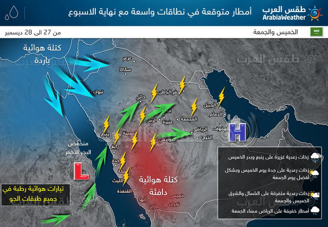 طقس العرب – م. ناصر حداد – يتوقع أن تتزايد رقعة وشدة الأمطار بمشيئة الله في أجزاء مختلفة من المملكة خلال الخميس والجمعة 27 و28 ديسمبر 2018، تُتبع بموجة برد وصقيع في المنطقة الشمالية الجمعة والسبت.