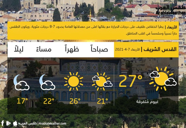 <p style=";text-align:left;direction:ltr"><strong>Météo arabe</strong> - Muhammad Awina - Une légère baisse des températures est attendue mercredi, et le temps printanier sera chaud à relativement chaud dans les hauteurs des montagnes, et chaud dans le reste des régions, avec l'apparition de quelques nuages élevés sur certaines zones , et les vents seront modérés d'ouest à nord-ouest.</p><p style=";text-align:left;direction:ltr"></p><p style=";text-align:left;direction:ltr"> <span style="font-size:22px;"><strong>Temps chaud la nuit</strong></span></p><p style=";text-align:left;direction:ltr"> Le temps reste plus chaud que d'habitude dans toutes les régions, et progressivement des quantités de nuages moyens et élevés apparaissent, et les vents seront légers du nord-ouest à grande vitesse.</p><p style=";text-align:left;direction:ltr"></p><p style=";text-align:left;direction:ltr"> <span style="font-size:22px;"><strong>Dans la bande de Gaza:</strong></span></p><ul style=";text-align:left;direction:ltr"><li style=";text-align:left;direction:ltr"> Les vents sont à vitesse légère, direction variable.</li><li style=";text-align:left;direction:ltr"> La mer est légère à moyenne de hautes vagues (20-80 cm).</li><li style=";text-align:left;direction:ltr"> Température de surface de l'eau de mer: 18 ° C</li></ul>