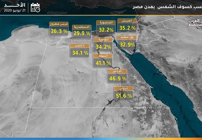 طقس العرب - سنان خلف - كسوف الشمس في مصر، حدثُ فلكي هام ستشهده سماء مصر يوم 21 يونيو الجاري، وسيكون كسوف الشمس مُشاهداً في مُختلف مناطق مصر، إلا أن نسبة كسوف الشمس في مصر ستكون أعلى في المحافظات والمدن الجنوبية.