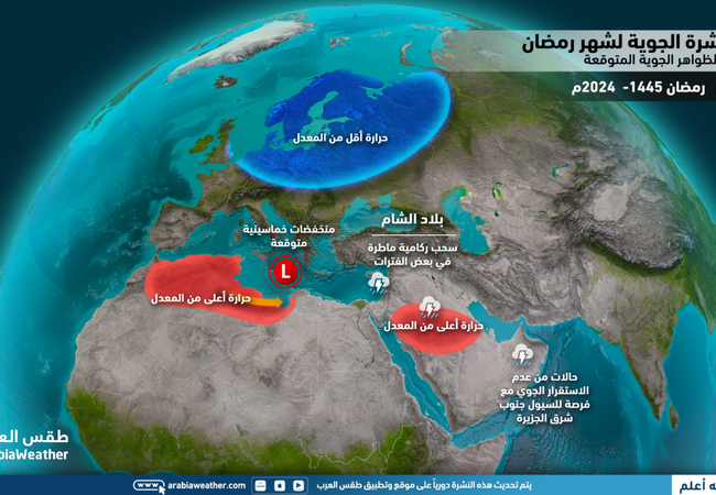 <p style=";text-align:left;direction:ltr"><strong>Météo arabe - L'équipe de prévision météorologique a récemment publié des prévisions météorologiques pour le mois de Ramadan et la période de l'Aïd al-Fitr, qui indiquent que de grandes fluctuations de température et des conditions météorologiques sur cinq jours prévalent dans certaines périodes, dont voici les détails :</strong></p><p style=";text-align:left;direction:ltr"></p><p style=";text-align:left;direction:ltr"> <strong>Situation générale:</strong></p><ul style=";text-align:left;direction:ltr"><li style=";text-align:left;direction:ltr"> Les températures sont plus chaudes que d'habitude en Égypte pendant le mois sacré du Ramadan.</li><li style=";text-align:left;direction:ltr"> Des fluctuations météorologiques claires sont attendues dans le temps.</li><li style=";text-align:left;direction:ltr"> Les dépressions mathématiques approchent la république plusieurs jours et provoquent des conditions météorologiques.</li><li style=";text-align:left;direction:ltr"> L'effet de la dépression pentatonique est suivi de masses d'air plus froides que d'habitude, ce qui réduit considérablement les températures et provoque des pluies éparses.</li></ul><p style=";text-align:left;direction:ltr"></p><p style=";text-align:left;direction:ltr"> <strong>Cartes aériennes</strong></p><p style=";text-align:left;direction:ltr"> Les phénomènes météorologiques attendus les plus importants </p><p style=";text-align:left;direction:ltr"><img alt="" src="/sites/default/files/uploads-2020/%D8%A7%D9%84%D8%B8%D9%88%D8%A7%D9%87%D8%B1%20%D8%A7%D9%84%D8%AC%D9%88%D9%8A%D8%A9%20%284%29.png" style="width: 1200px; height: 675px;" /></p><p style=";text-align:left;direction:ltr"> Écart de température par rapport aux moyennes générales <br /></p><p style=";text-align:left;direction:ltr"><img alt="" src="/sites/default/files/uploads-2020/%D8%A7%D9%84%D8%AD%D8%B1%D8%A7%D8%B1%D8%A9%20%284%29.png" style="width: 1200px; height: 675px;" /></p><p style=";text-align:left;direction:ltr"> Écart des précipitations par rapport aux moyennes générales <br /></p><p style=";text-align:left;direction:ltr"><img alt="" src="/sites/default/files/uploads-2020/%D8%A7%D9%84%D8%A7%D9%85%D8%B7%D8%A7%D8%B1%20%284%29.png" style="width: 1200px; height: 675px;" /></p><hr /><h2 style=";text-align:left;direction:ltr"> <strong>Conditions météorologiques particulières pour chaque semaine :</strong></h2><h3 style=";text-align:left;direction:ltr"> <strong>La première semaine (1-7 Ramadan), correspondant au 11-17 mars 2024 :</strong></h3><ul style=";text-align:left;direction:ltr"><li style=";text-align:left;direction:ltr"> <strong>Pluie:</strong></li></ul><p style=";text-align:left;direction:ltr"> <strong>Égypte et Soudan :</strong> <strong> </strong> Convertissez en dessous des moyennes.</p><ul style=";text-align:left;direction:ltr"><li style=";text-align:left;direction:ltr"> <strong>Températures</strong> :</li></ul><p style=";text-align:left;direction:ltr"> <strong>Egypte et Soudan :</strong> plus chaud que la moyenne.</p><ul style=";text-align:left;direction:ltr"><li style=";text-align:left;direction:ltr"> <strong>Et</strong> <strong>le cours de la semaine :</strong></li></ul><p style=";text-align:left;direction:ltr"> Il est prévu que les dépressions atmosphériques soient actives dans le sud-ouest du continent européen, s'étendant aux pays du Maghreb et au centre du continent européen, entraînant une augmentation de la pression atmosphérique dans le bassin oriental de la mer Méditerranée, le Levant et Egypte. En conséquence, l’atmosphère se stabilise en général et les températures augmentent et sont supérieures à la moyenne dans la plupart des régions.</p><hr /><h3 style=";text-align:left;direction:ltr"> <strong>La deuxième semaine (Ramadan 8-14), correspondant au 18-24 mars 2024 :</strong></h3><ul style=";text-align:left;direction:ltr"><li style=";text-align:left;direction:ltr"> <strong>Pluie:</strong></li></ul><p style=";text-align:left;direction:ltr"> <strong>Egypte :</strong> En dessous de la moyenne (pluies éparses sur la côte nord).</p><p style=";text-align:left;direction:ltr"> <strong>Soudan :</strong> Dans la moyenne (pas de pluie significative).</p><ul style=";text-align:left;direction:ltr"><li style=";text-align:left;direction:ltr"> <strong>Températures</strong> :</li></ul><p style=";text-align:left;direction:ltr"> Egypte et Soudan : le temps devient plus chaud que la moyenne.</p><ul style=";text-align:left;direction:ltr"><li style=";text-align:left;direction:ltr"> <strong>Et</strong> <strong>le cours de la semaine :</strong></li></ul><p style=";text-align:left;direction:ltr"> La pression atmosphérique devrait augmenter sur certaines parties du sud et de l’ouest du continent européen et sur le bassin occidental de la mer Méditerranée, entraînant un mouvement de l’activité aérienne et des dépressions atmosphériques vers le continent européen oriental, en tant qu’extension de la mer Méditerranée orientale. Les conditions météorologiques khamsiniennes prévalent au début de la période, et peu de temps après, l'Égypte est progressivement affectée par une masse d'air plus froide que d'habitude, ce qui provoque une baisse significative des températures avec un risque de pluie.</p><hr /><h3 style=";text-align:left;direction:ltr"> <strong>La troisième semaine (Ramadan 15-21), correspondant au 25-31 mars 2024 :</strong></h3><ul style=";text-align:left;direction:ltr"><li style=";text-align:left;direction:ltr"> <strong>Pluie:</strong></li></ul><p style=";text-align:left;direction:ltr"> <strong>Egypte :</strong> Transféré en dessous de la moyenne.</p><p style=";text-align:left;direction:ltr"> <strong>Soudan :</strong> A propos des tarifs (pluies éparses au sud).</p><ul style=";text-align:left;direction:ltr"><li style=";text-align:left;direction:ltr"> <strong>Températures</strong> :</li></ul><p style=";te
