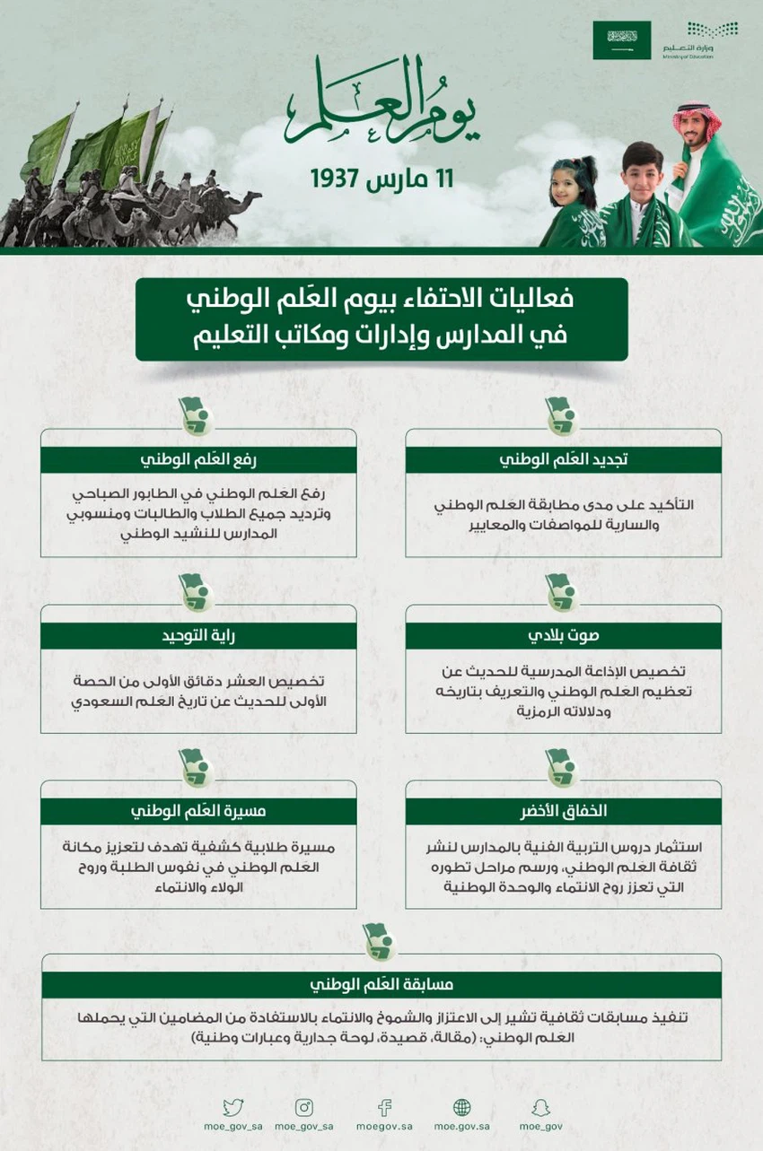 En célébrant cette occasion, le ministère cherche à approfondir et à promouvoir les valeurs nationales dans le cœur des étudiants et étudiantes, citoyens et résidents, en plus d'inculquer l'importance du drapeau et ses connotations symboliques dans l'esprit des étudiants, car le développement du drapeau saoudien raconte l'histoire de la patrie et de ses étapes de renaissance, et représente également un engagement envers le système du drapeau et ses normes.Un aspect important du respect de son symbolisme et de ses connotations nationales et historiques qui font référence au monothéisme, à la justice , force, croissance et prospérité.