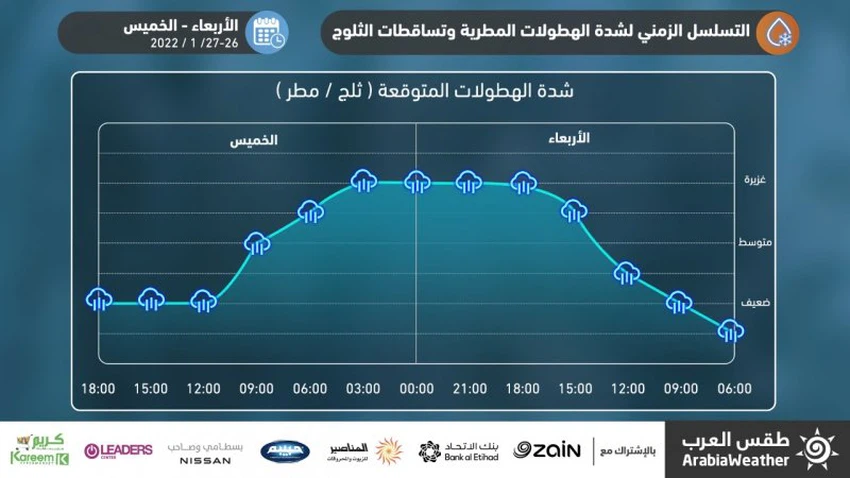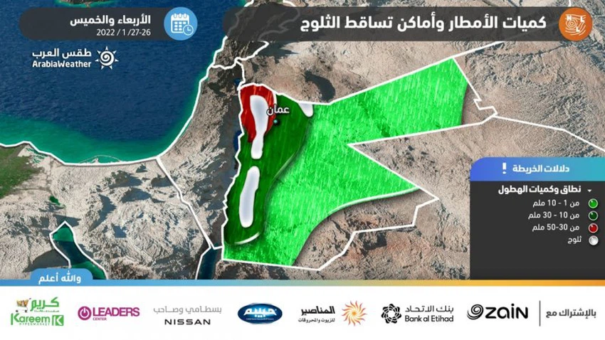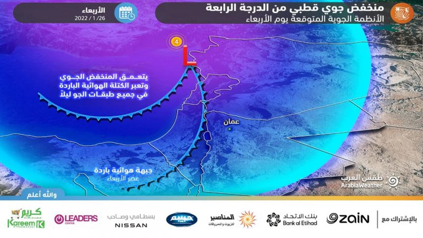 Météo arabe - m. Nasser _ Haddad La région du Levant, incluant la Jordanie, est touchée par une dépression atmosphérique d'origine polaire classée au quatrième degré (très efficace), progressivement au cours de la journée de mercredi, correspondant au 26 janvier 2022 et se poursuit avec une sévérité variable également au cours de jeudi, apportant avec lui de la pluie et des primes pour diverses régions et de la neige sur les zones dont la hauteur est supérieure à 800 mètres au-dessus du niveau de la mer, si Dieu le veut.