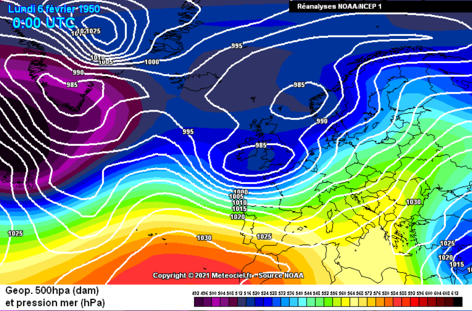 Une image montrant les températures dans la couche de 500 hPa le 6 février 1950