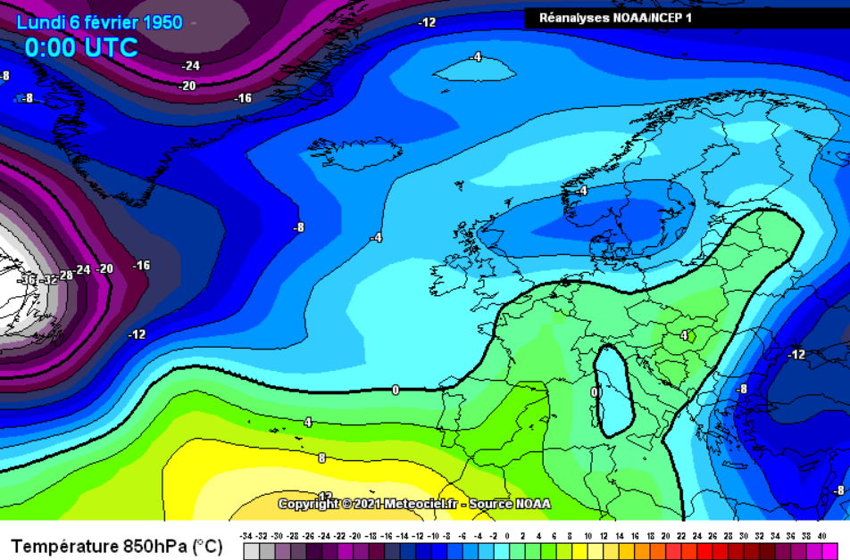 Une image montrant les températures dans la couche de 850 hpa le 6 février 1950